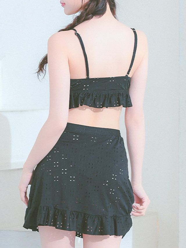 3. 水着 エンブロイダリー レース カットアウト リボン ビスチェ 体型カバー フリル ラップスカート 韓国風 ガーリー タンキニ (ブラック/雨宮由乙花着用)