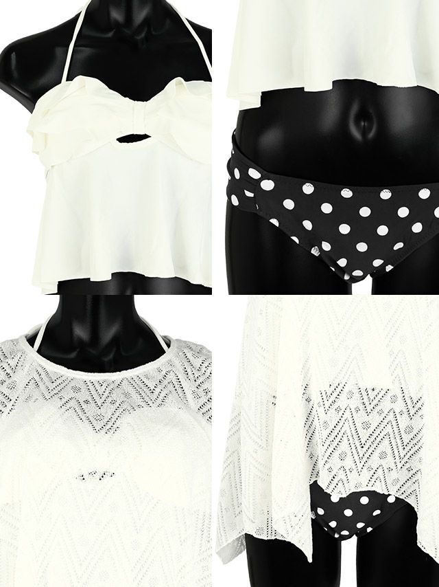 かぎ編みレースTシャツ付きホルターネックフリルビスチェドット柄ショーツ3点セット水着