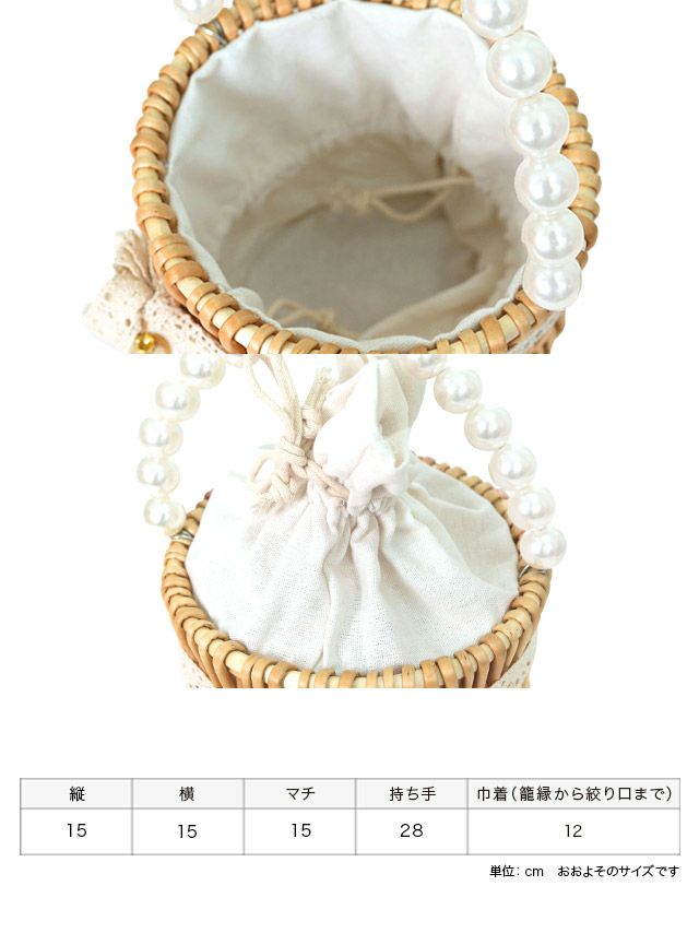 選べるラウンド型&スクエア型パールハンドルレースリボンかごバッグのディティール サイズ表