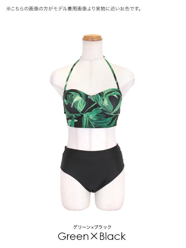 3. [水着] ビスチェ ホルターネック ハイウエスト リーフプリント カジュアル ギャル グリーン ブラック Lサイズあり 大きいサイズ カジュアル ビキニ (KATOMIKA着用) [tk-sw2131]
