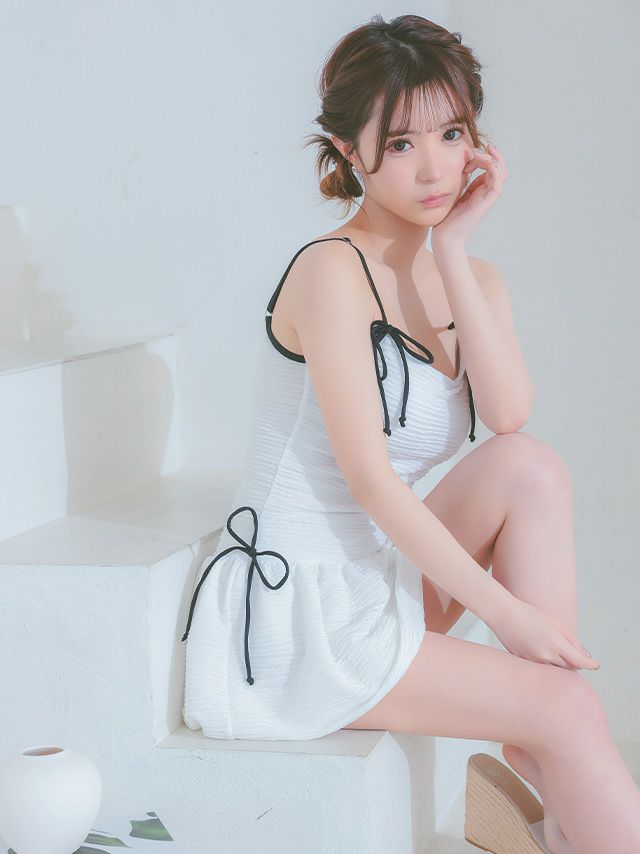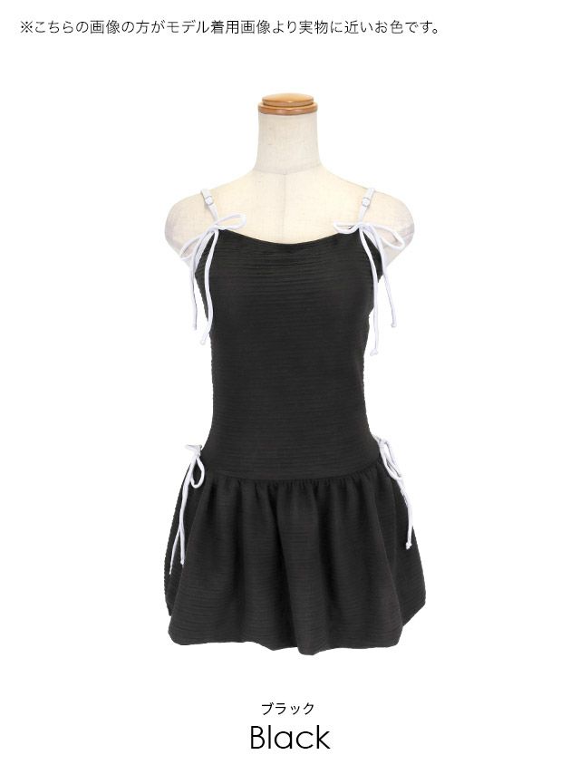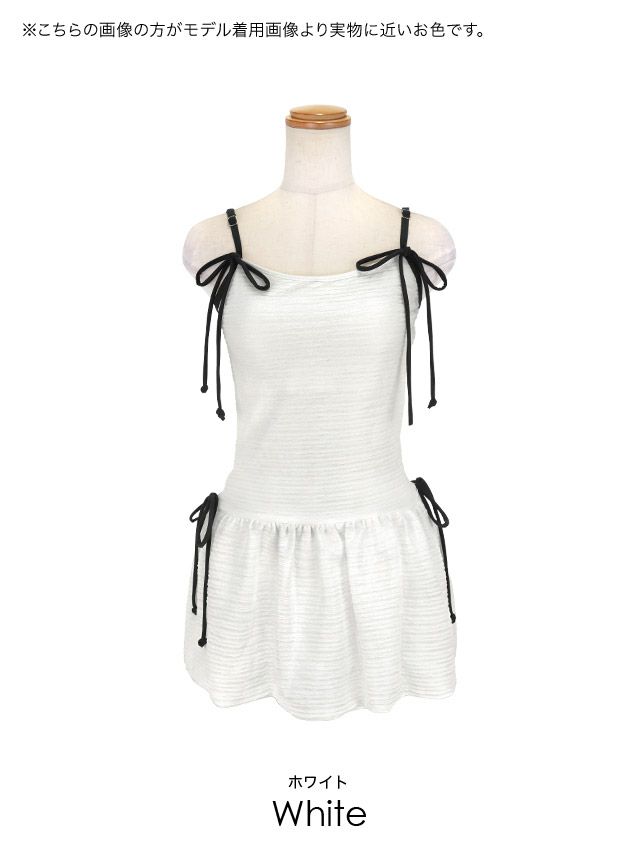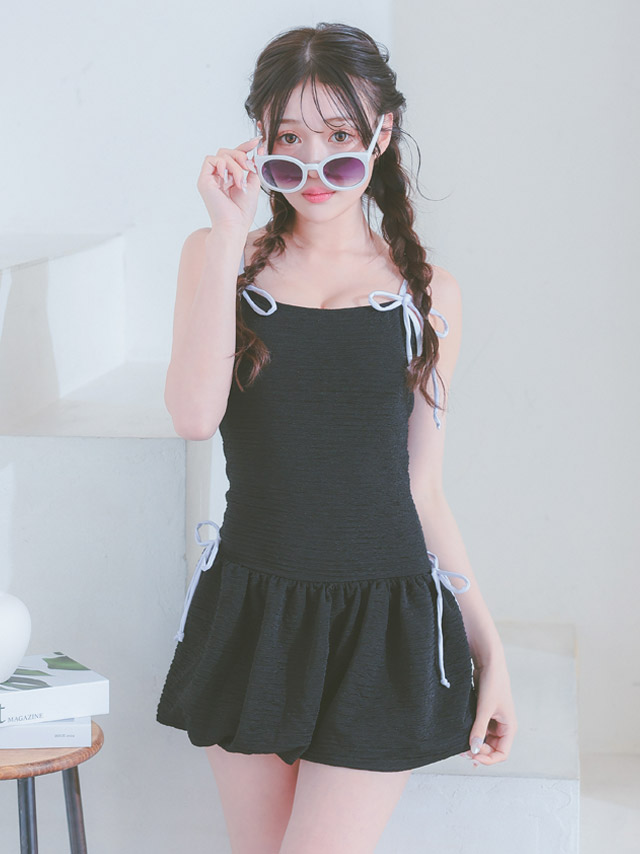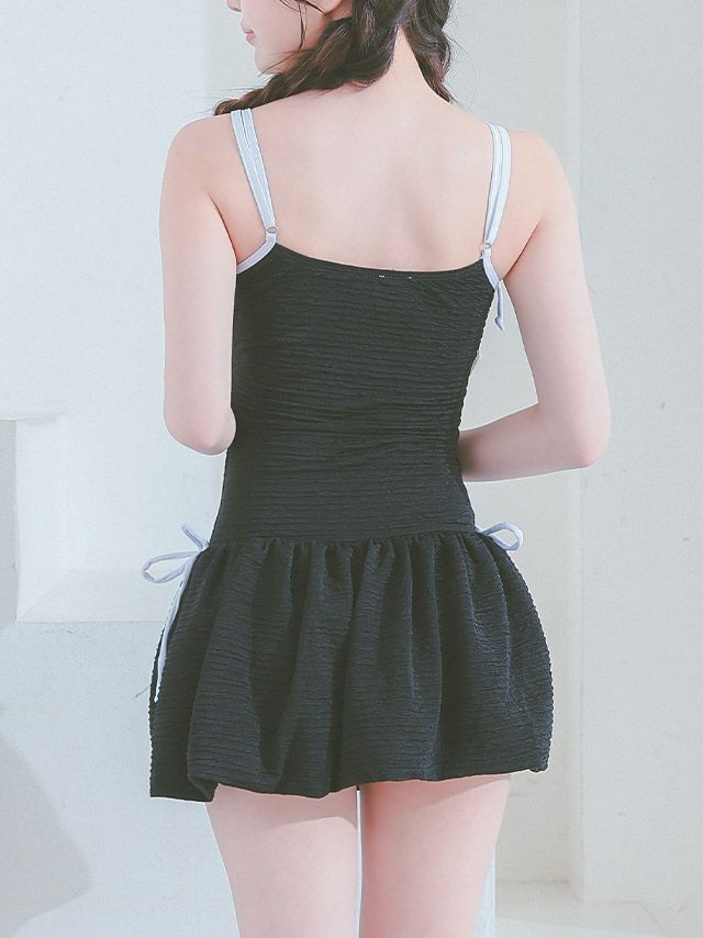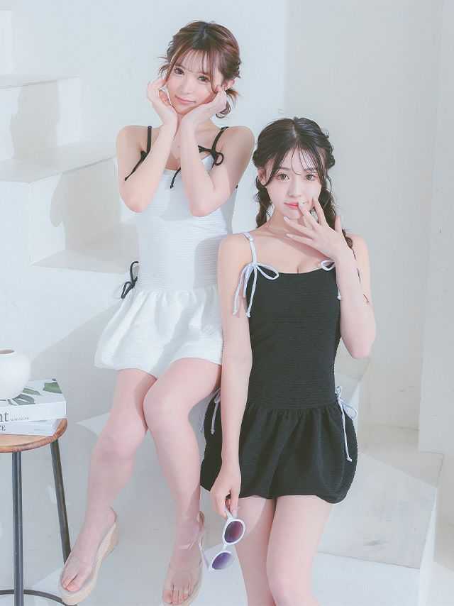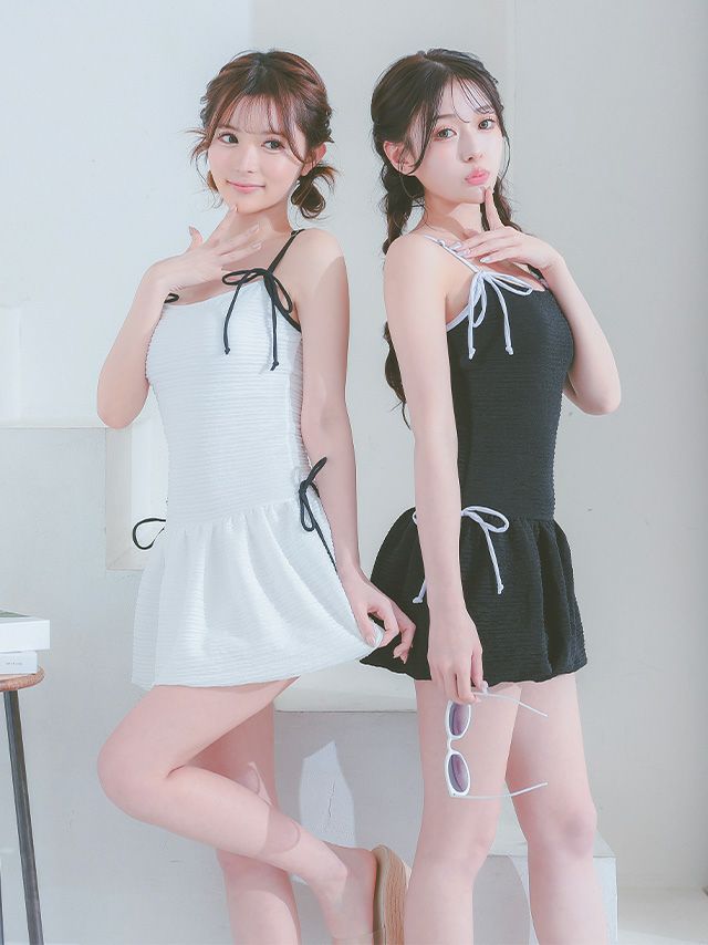 5. 水着 バイカラーリボン 韓国風 体型カバー ガーリー ワンピースビキニ (ホワイト/聖菜着用)(ブラック/雨宮由乙花着用)