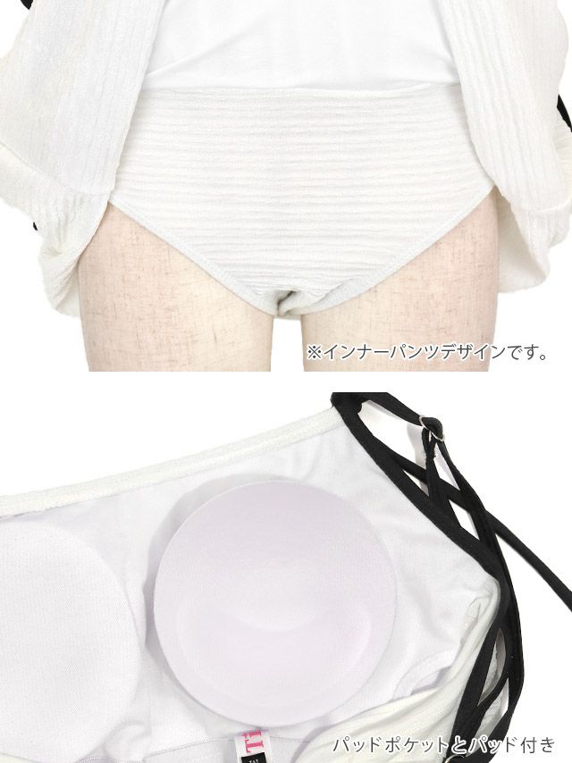 4. 水着 バイカラーリボン 韓国風 体型カバー ガーリー ワンピースビキニ (ホワイト/聖菜着用)(ブラック/雨宮由乙花着用)