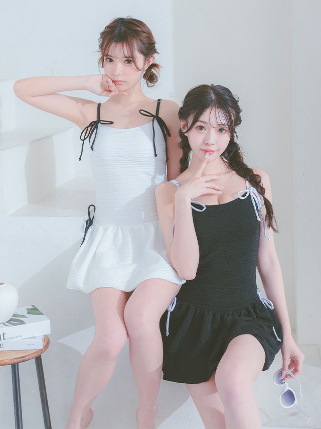 3. 水着 バイカラーリボン 韓国風 体型カバー ガーリー ワンピースビキニ (ブラック/雨宮由乙花着用)