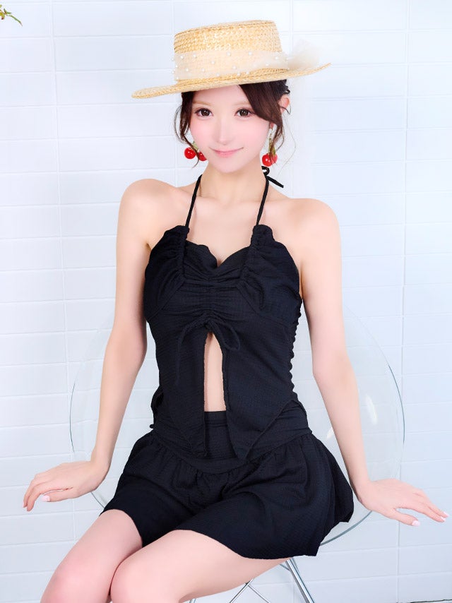 3. [水着] 体型カバー ホルターネック ビスチェ ハイウエスト タンキニ ドロスト 洋服みたいな シンプル スカートタイプ 清楚系 ガーリー 黒 ブラック ビキニ (聖菜着用) [tk-sw6621]