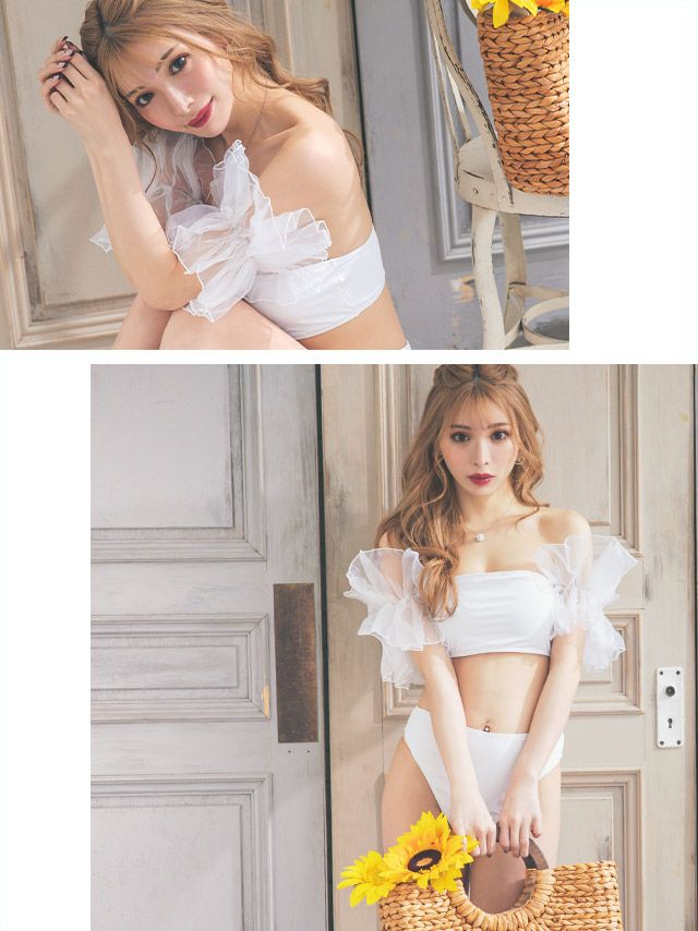 4. 水着 ボリュームスリーブガーリーオフショルバンドゥビキニ