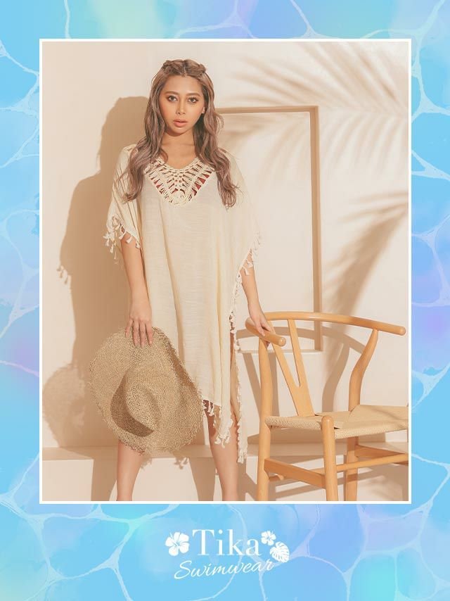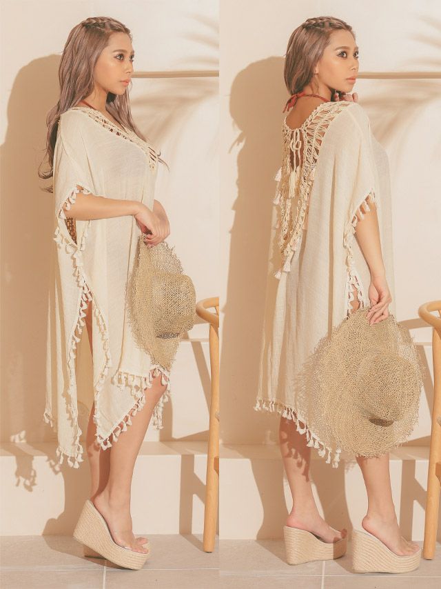 3. 水着小物 タッセルフリンジ付きエスニックポンチョワンピース