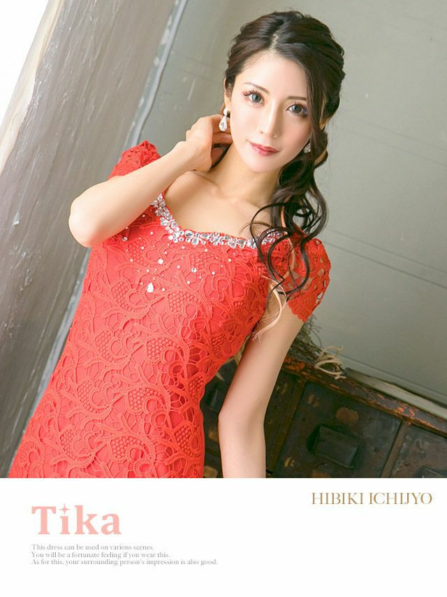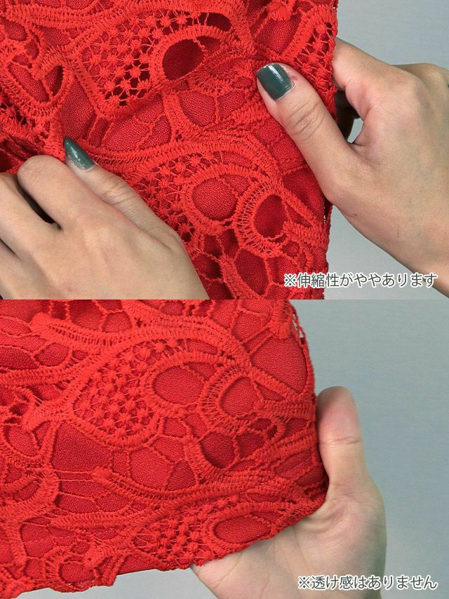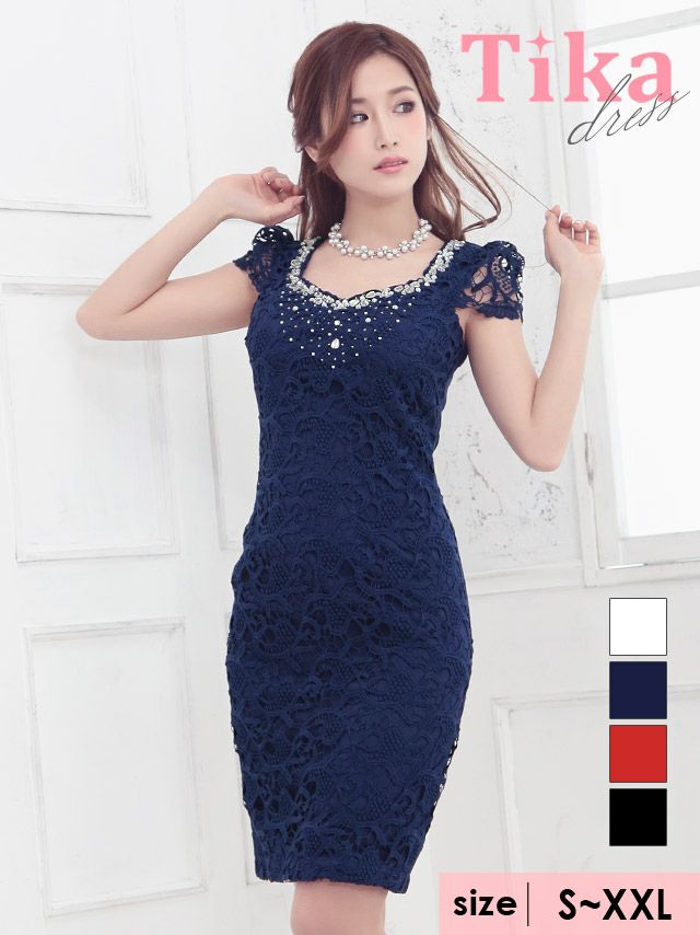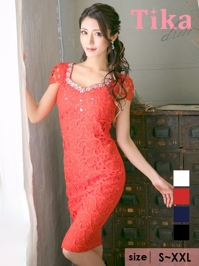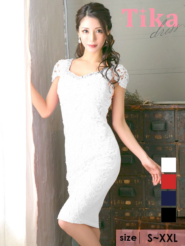 tika ティカ キャバドレス インスタライブで詳しくドレス紹介動画 クロッシェレース半袖タイト膝丈ドレスのサイズ表 クロッシェレース半袖タイト膝丈ドレスのスペック表