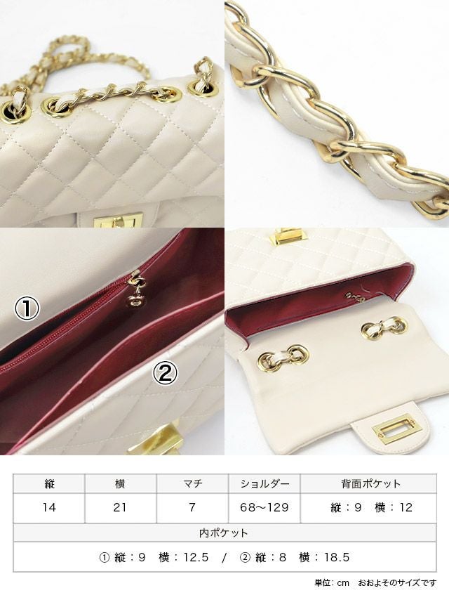 キルティングゴールドチェーン2Wayバッグのディティール サイズ表