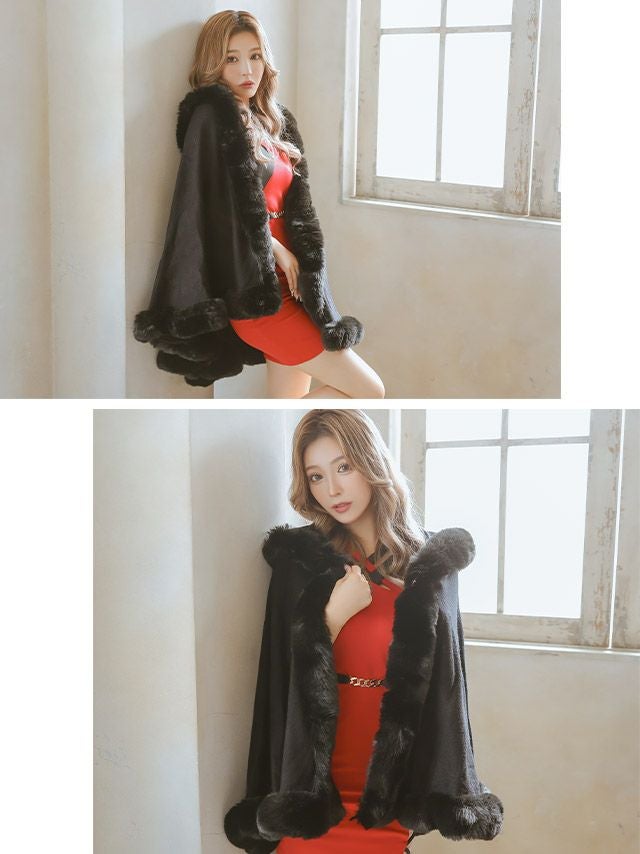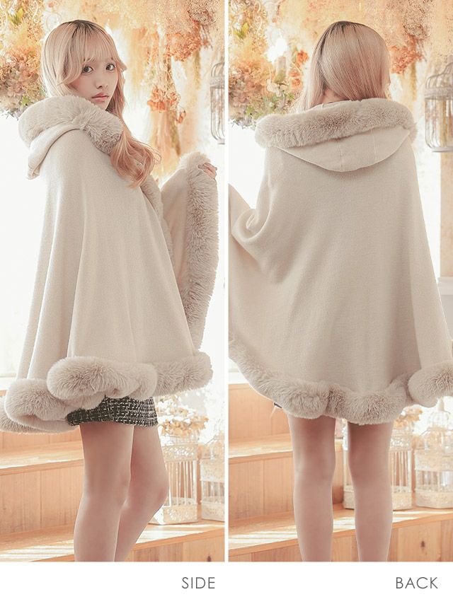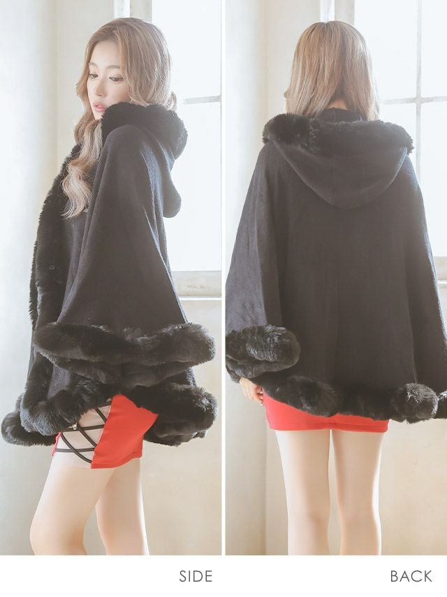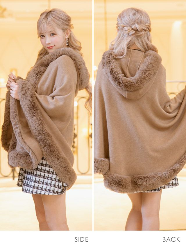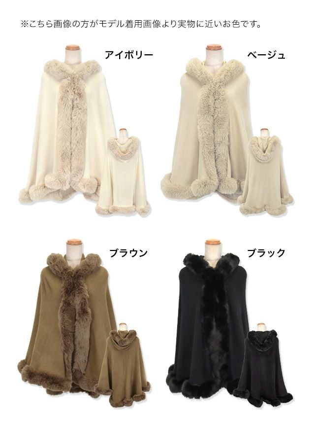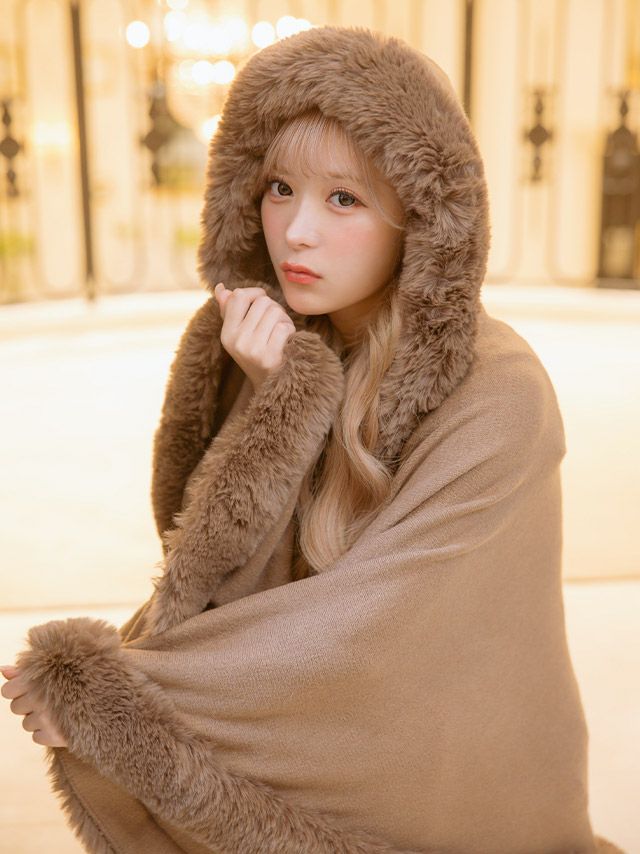 [SALE] フード付きフェイクファーニットケープ大判ショール (重川茉弥/羽織り着用)