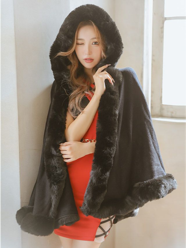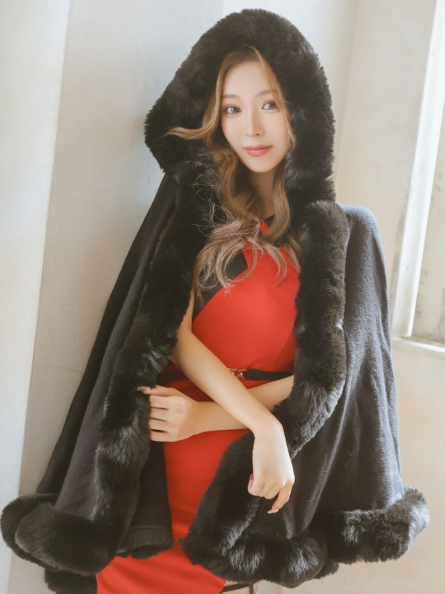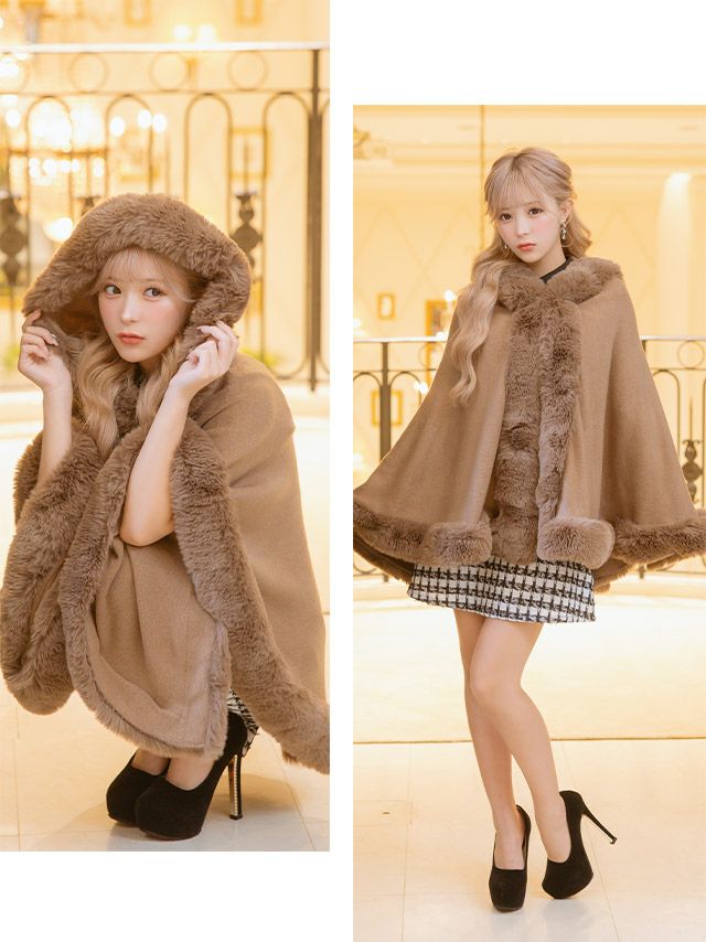 3. [SALE] フード付きフェイクファーニットケープ大判ショール (重川茉弥/羽織り着用)