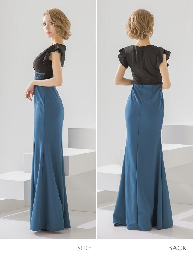 カシュクールフリル半袖バイカラーフラワー刺繍デザインスリットマーメイドロングドレスのカラーバリエーション