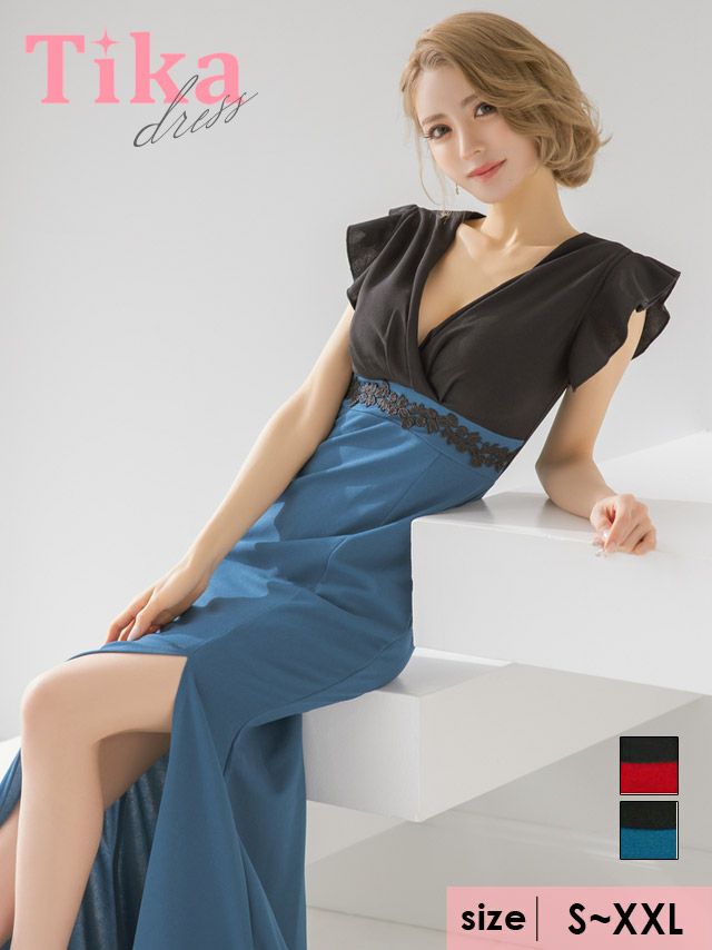キャバドレス ロング丈 マキシ丈 キャバクラ クラブ ラウンジ タイト Tika ティカ カシュクールフリル半袖バイカラー刺繍デザインスリットマーメイドロングドレス