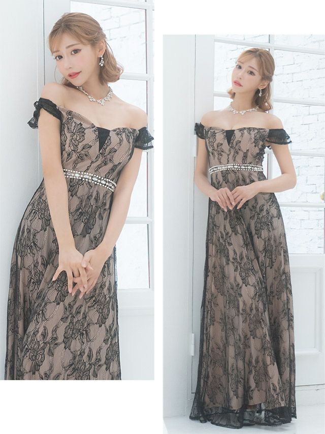 4. 2WayオフショルダーウエストパールビジューラインオールレースAラインロングドレス (Sサイズ~XXLサイズ) (明日花キララ/キャバドレス着用)