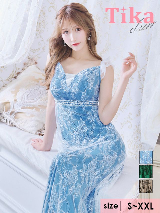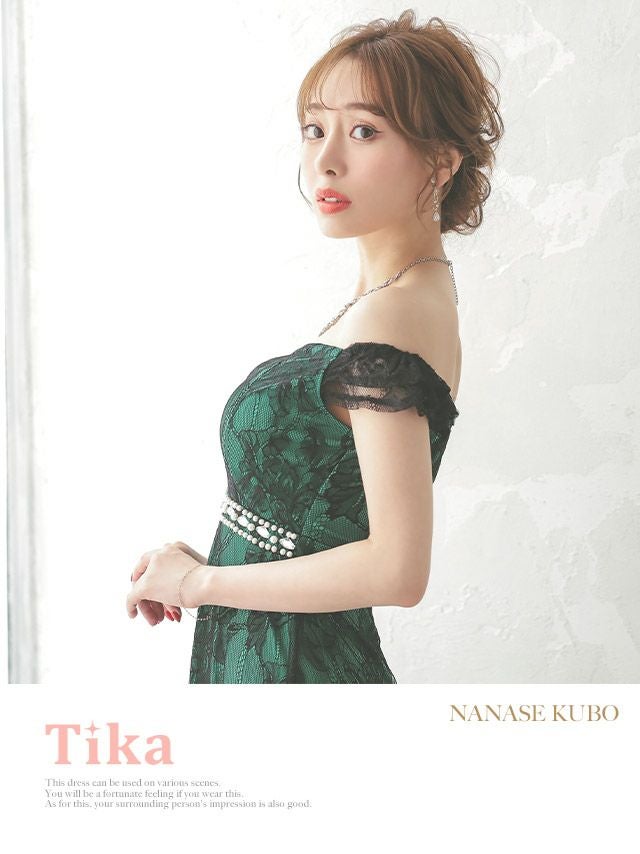 キャバドレス ロング丈 マキシ丈 大きいサイズ Tika ティカ 2WayオフショルダーウエストパールビジューラインオールレースAラインロングドレス