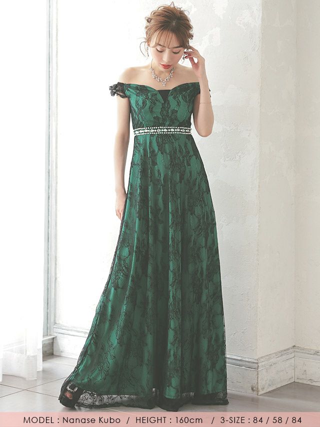 2WayオフショルダーウエストパールビジューラインオールレースAラインロングドレス (Sサイズ~XXLサイズ) (明日花キララ/キャバドレス着用)