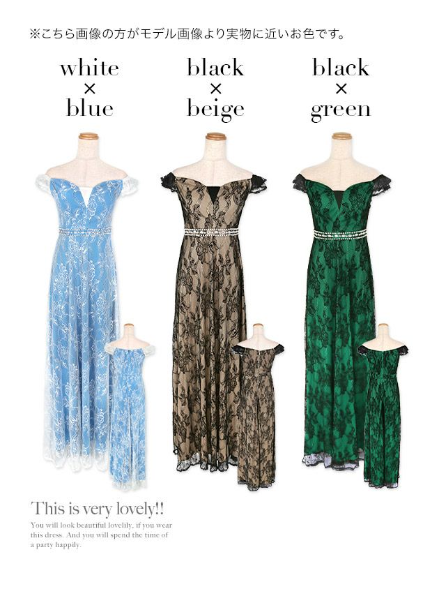 2WayオフショルダーウエストパールビジューラインオールレースAラインロングドレスのカラーバリエーション