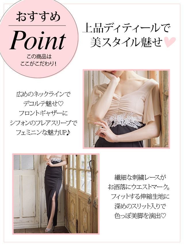シフォンフレアスリーブフラワー刺繍ハイウエスト切り替え半袖スリットタイトロングドレスの商品特徴