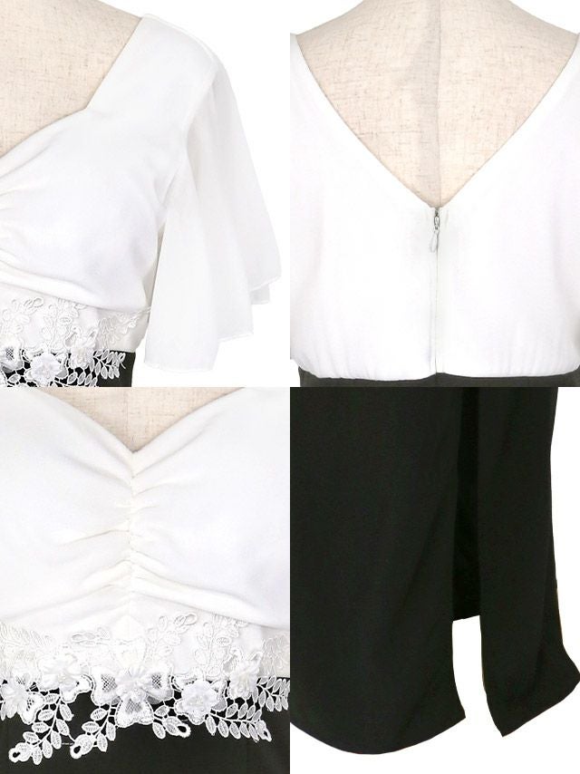 誘惑的なメリハリボディに♡ シフォンフレアスリーブフラワー刺繍ハイウエスト切り替え半袖タイトロングドレス (Sサイズ~XXLサイズ) (ゆんころ/キャバドレス着用)