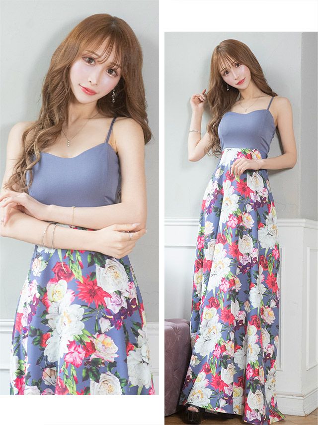 4. キャミソールンフラワープリントAラインロングドレス (Sサイズ~XXXLサイズ) (浦西ひかる/キャバドレス着用)