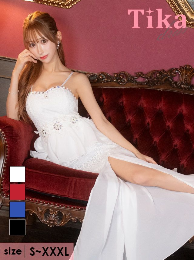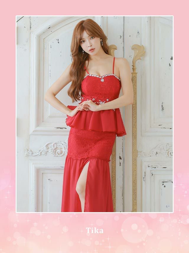 3. バストビジューレースペプラム切替シフォンキャミソールタイトロングドレス (Sサイズ~XXXLサイズ) (ゆんころ/キャバドレス着用)