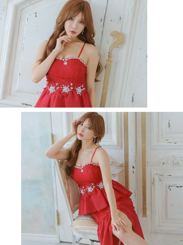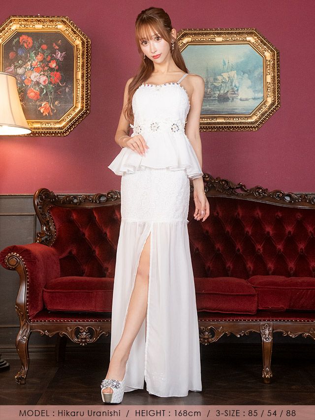 4. バストビジューレースペプラム切替シフォンキャミソールタイトロングドレス (Sサイズ~XXXLサイズ) (ゆんころ/キャバドレス着用)