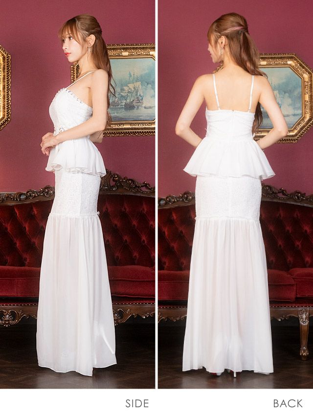 バストビジューレースペプラム切替シフォンスリットキャミソールタイトロングドレスのサイドバッグ全身