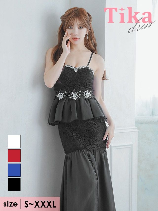 圧倒的な存在感を放つ☆彡 バストビジューレースペプラム切替シフォンキャミソールタイトロングドレス (Sサイズ~XXXLサイズ) (ゆんころ/キャバドレス着用)