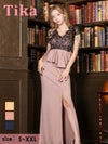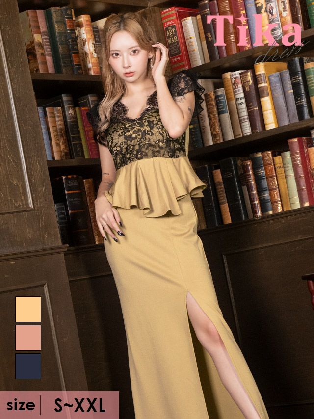 キャバドレス ロング丈 大きいサイズ 袖あり Tika ティカ 半袖ブラックスカラップレースアシメぺプラム切り替えスリットストレッチタイトロングドレス