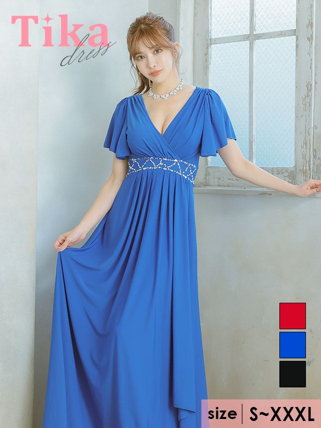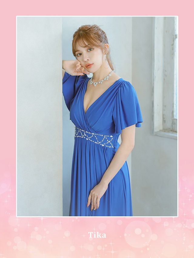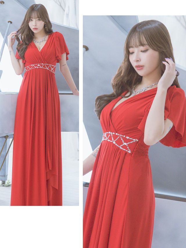 3. 半袖カシュクールネックフリル袖ウエストビジューラインドレープAラインロングドレス (Sサイズ~XXXLサイズ) (PyunA./キャバドレス着用)