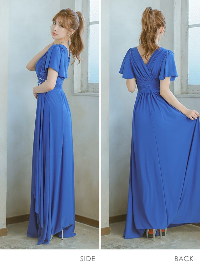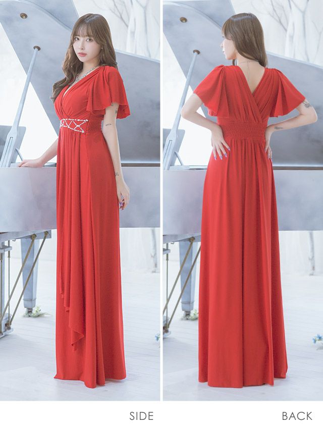 半袖カシュクールネックフリル袖ウエストビジューラインドレープクリスマスAラインロングドレスのサイドバッグ全身
