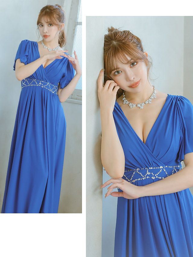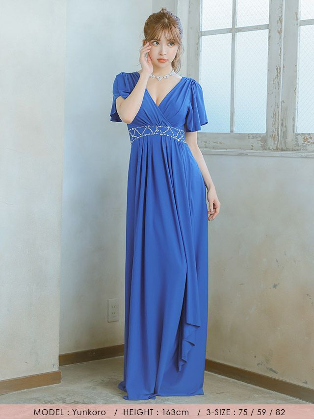 4. 半袖カシュクールネックフリル袖ウエストビジューラインドレープAラインロングドレス (Sサイズ~XXXLサイズ) (PyunA./キャバドレス着用)