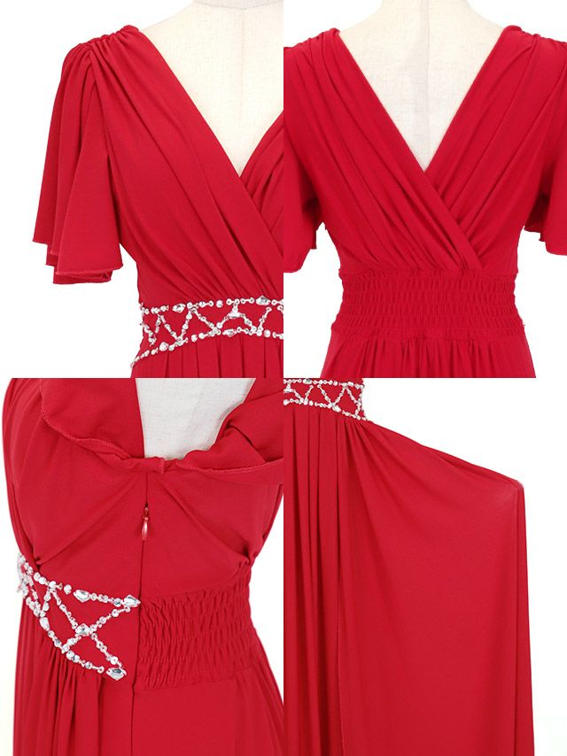 半袖カシュクールネックフリル袖ウエストビジューラインドレープクリスマスAラインロングドレスの商品詳細1