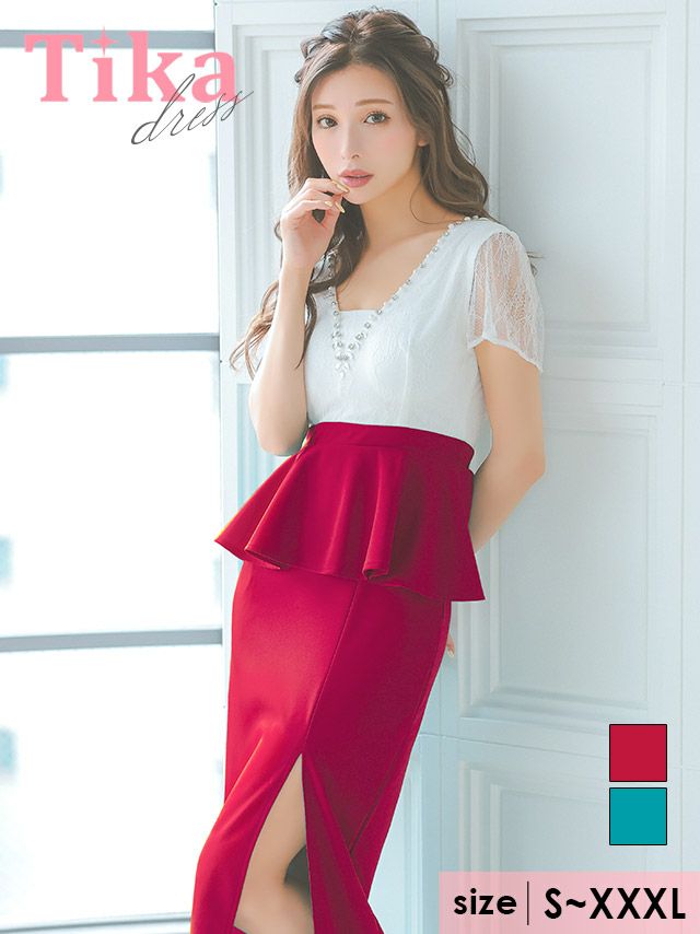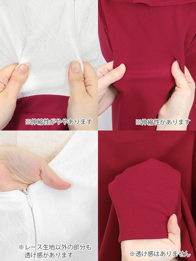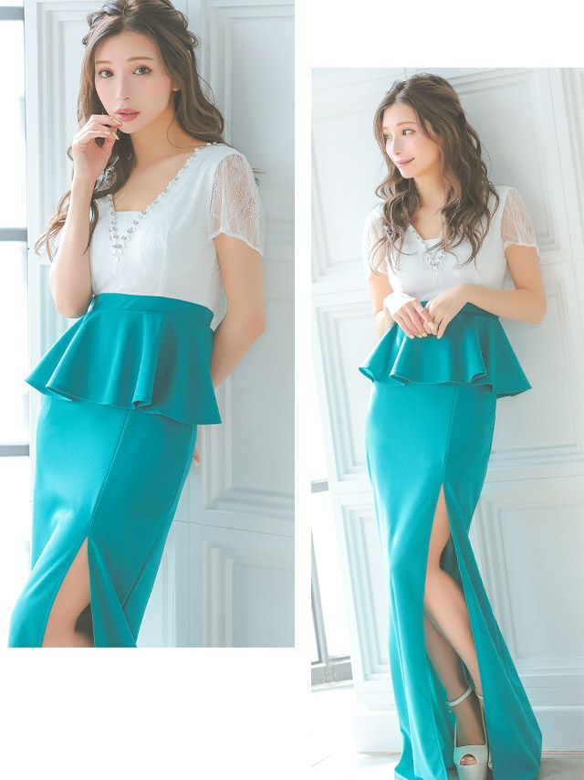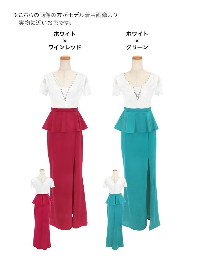 ホワイトレースビジュー切替ペプラムスリット半袖タイトロングドレスのカラーバリエーション