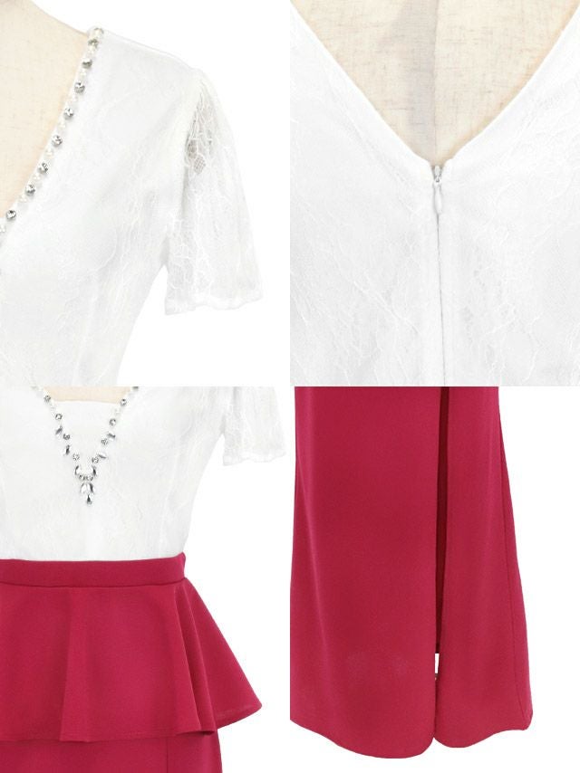 ホワイトレースビジュー切替ペプラムスリット半袖タイトロングドレスのメイン画像