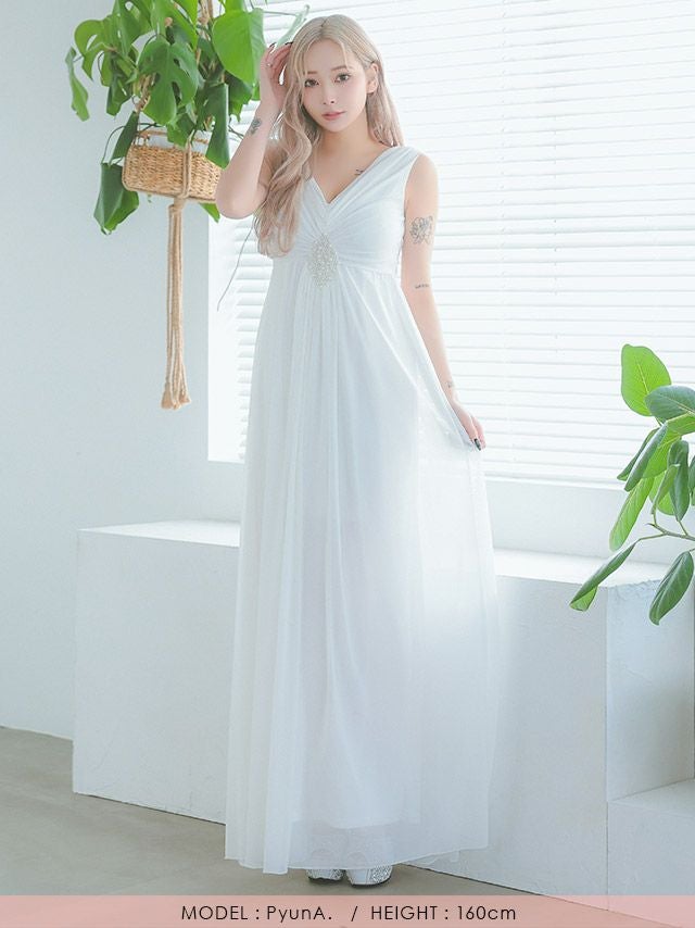 ノースリーブVネックウエストパールドレープAラインロングドレスのフロント全身