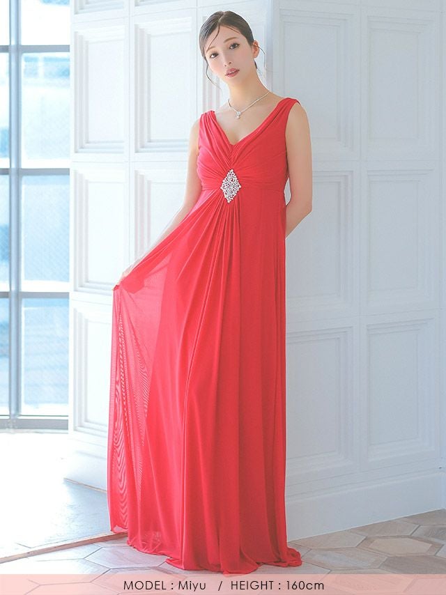 ノースリーブVネックウエストパールドレープAラインロングドレスの商品特徴