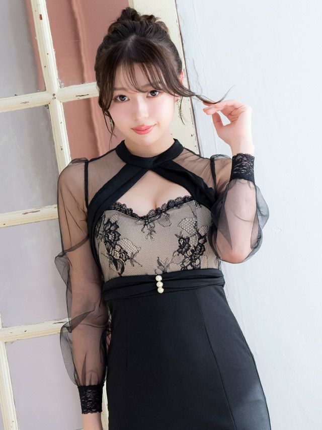 4. タイト ロングドレス 長袖 谷間 大きいサイズ 大人 スリット レース ハイネック ストレッチ シアースリーブ バストカット ワンカラー キャバドレス (雨宮由乙花着用)