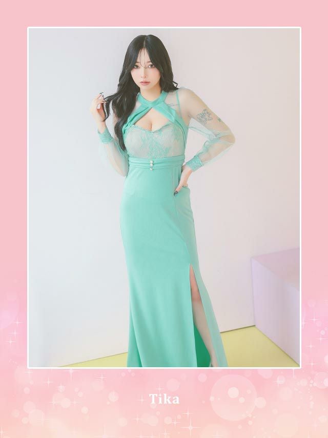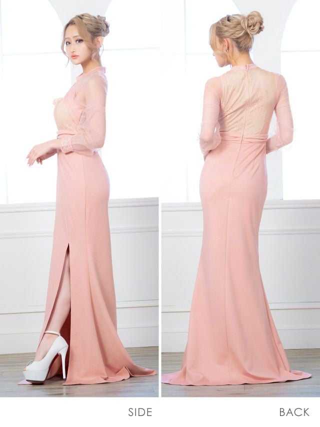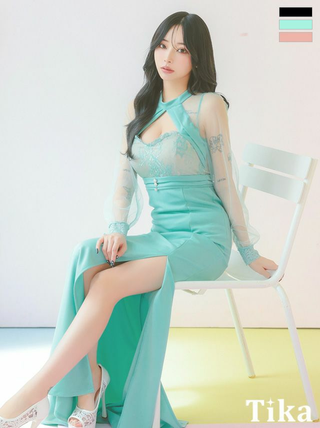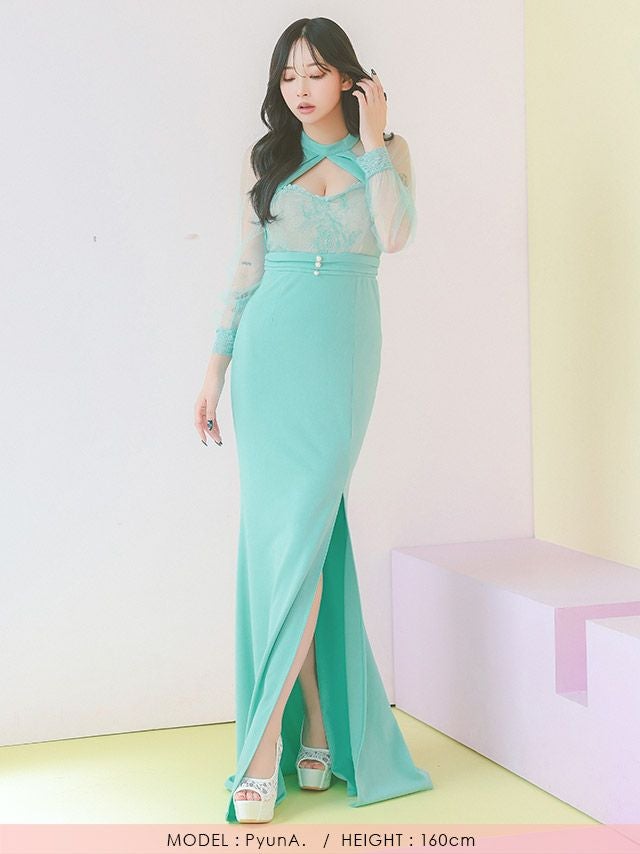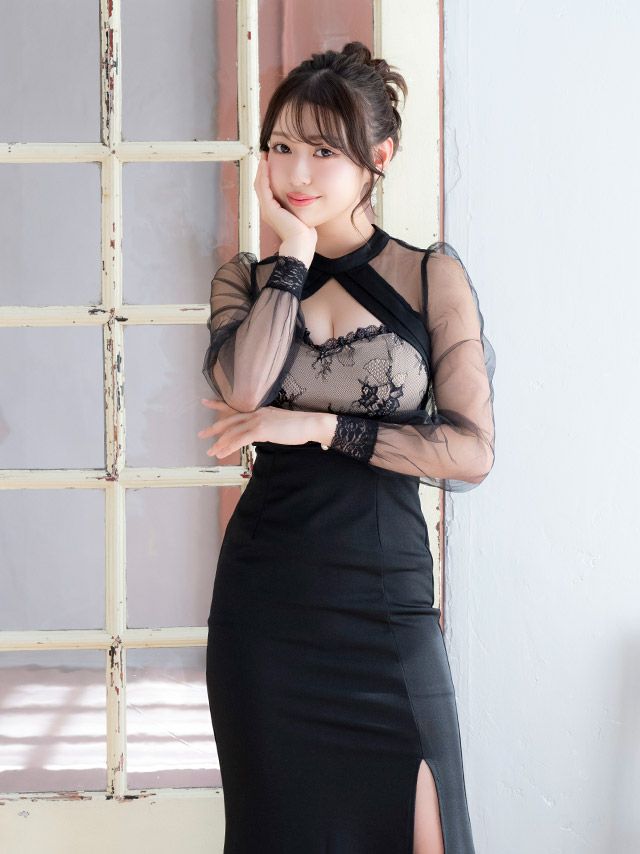 5. タイト ロングドレス 長袖 谷間 大きいサイズ 大人 スリット レース ハイネック ストレッチ シアースリーブ バストカット ワンカラー キャバドレス (雨宮由乙花着用)