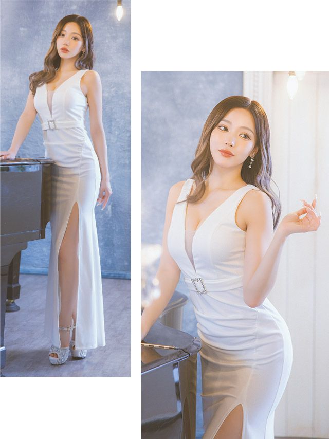 4. [SALE] ビジューバックルウエストベルト付きバストシアーノースリーブストレッチタイトロングドレス (Sサイズ~XLサイズ) (せいせい/キャバドレス着用)