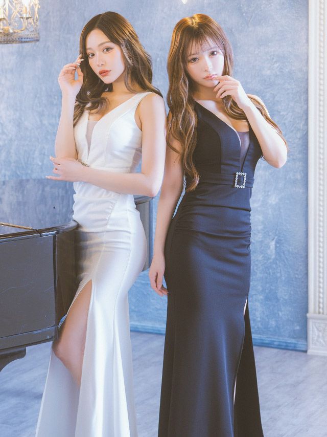 ビジューバックルウエストベルト付きバストシアーノースリーブストレッチスリットタイトロングドレスのカラーバリエーション