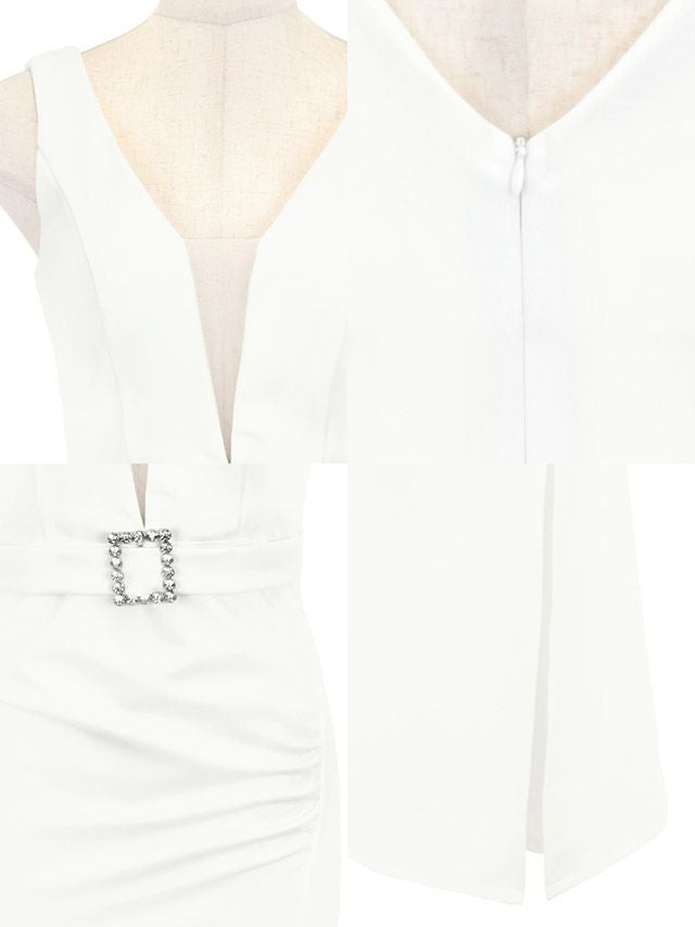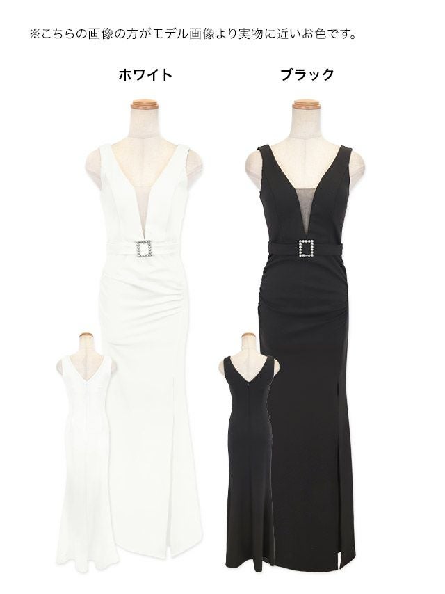 バストチュール切り替えノースリーブビジュー付きバックルウエストベルトワンカラースリットタイトロングドレスの商品特徴