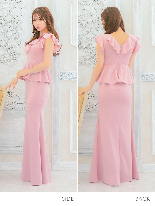 5. ロングドレス ペプラム タイト スリット ノースリーブ ストレッチ ジップ フリル袖 クロスネック ワンカラー ピンク 大きいサイズ キャバドレス (黒嵜菜々子着用) [tk-ld25918-h]