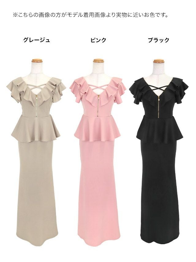 タイト ロングドレス 谷間 大きいサイズ レース スリット ノースリーブ ペプラム ジップ フリルデザイン クロスネック キャバドレスのカラーバリエーション