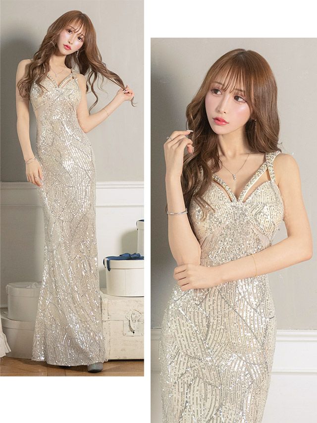 ビジュー付きハートカットキャミソールシアーくびれゴージャススパンコールタイトロングドレスの商品詳細1