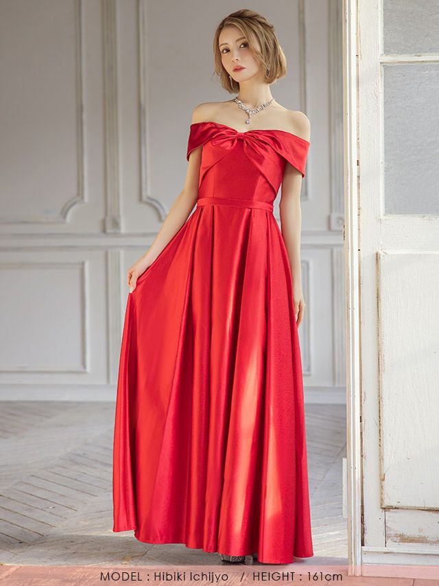 5. リボンデザインオフショルダーワンカラー Aラインロングドレス (XSサイズ~XXLサイズ) (一条響/キャバドレス着用)