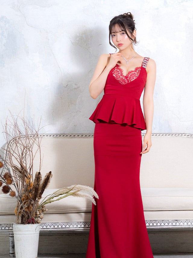 5. ロングドレス ノースリーブ ビジュー タイト 谷間 レース 大きいサイズ ストレッチ ペプラム レース 大人 高身長 お腹カバー 赤ドレス キャバドレス XL XXL (黒嵜菜々子着用)[tk-ld7649l-ha]