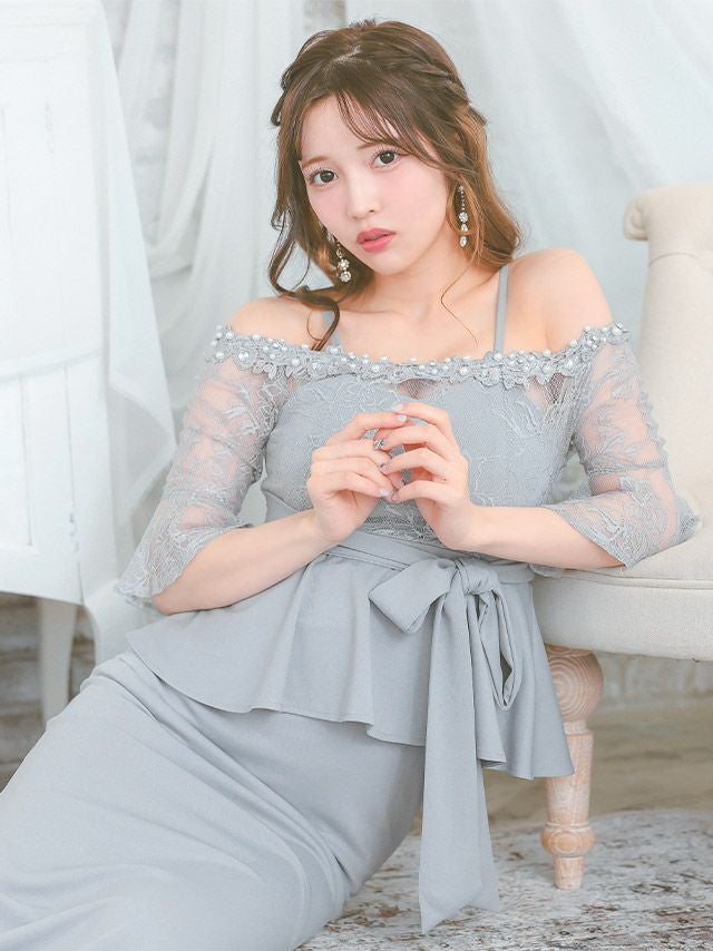 肩あき 3Dフラワー パール シアーレース 袖あり ウエストリボン ペプラム ストレッチ バックスリット タイトロングドレスのメイン画像