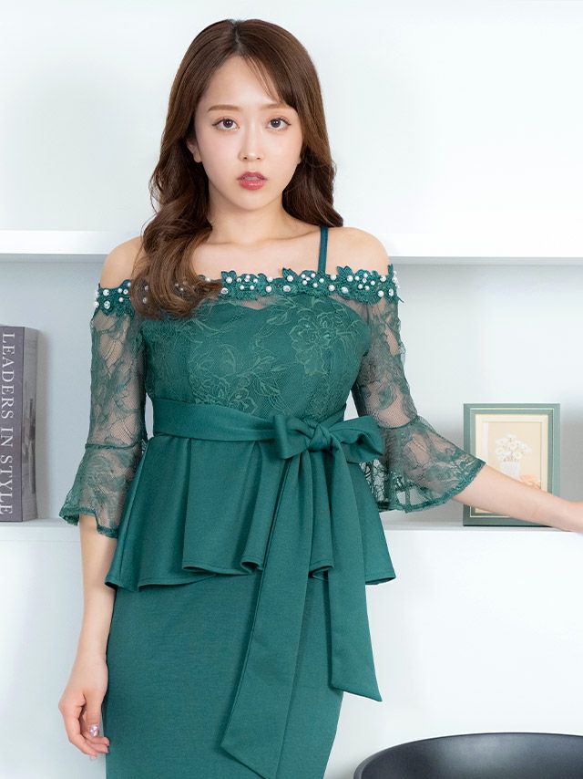 肩あき 3Dフラワー パール シアーレース 袖あり ウエストリボン ペプラム ストレッチ バックスリット タイトロングドレスの商品詳細1