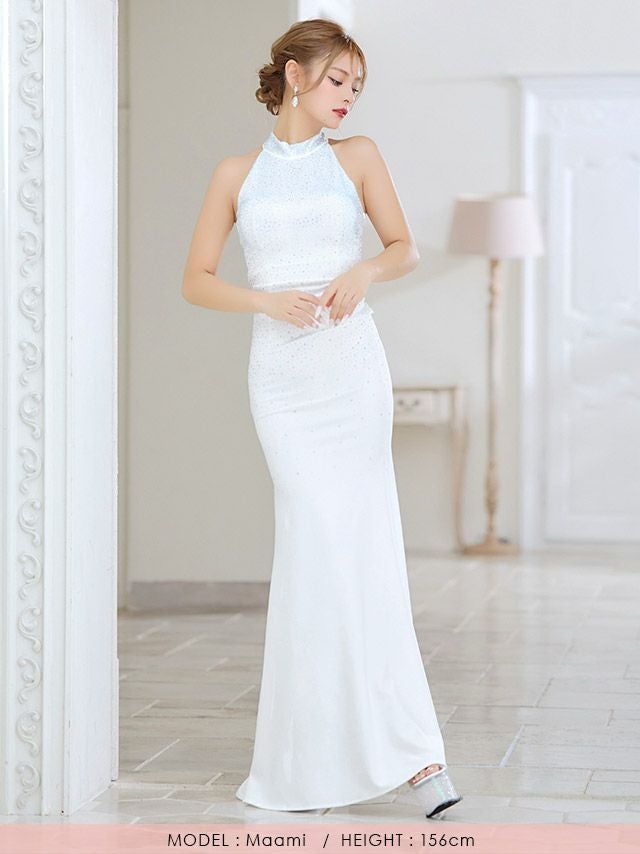 ホルターネックキラキラビジューデザインストレッチタイトロングドレスのメイン画像