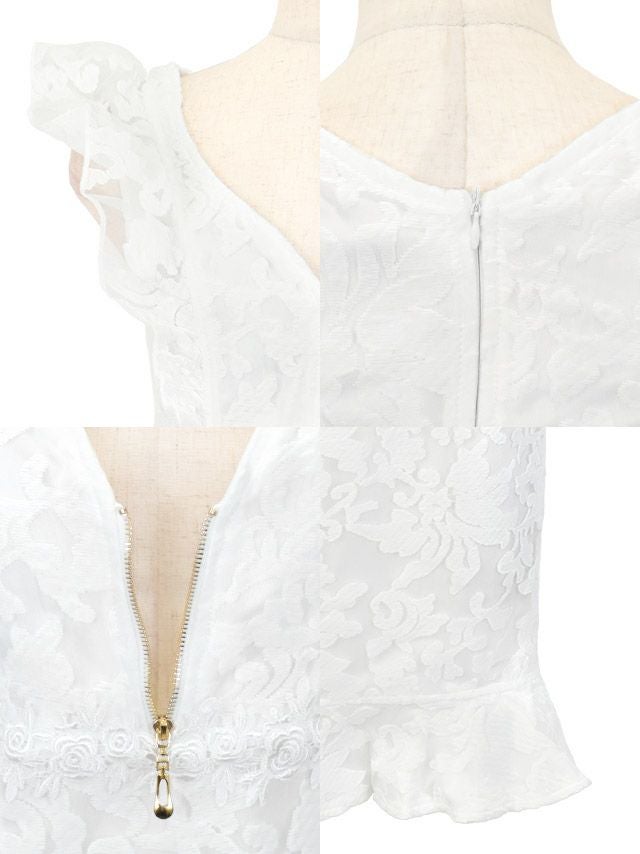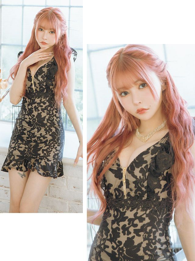 4. フラワーシフォン ノースリーブ フリル袖 バストジップ タイトミニドレス (Sサイズ~XLサイズ) (戦慄かなの/キャバドレス着用)